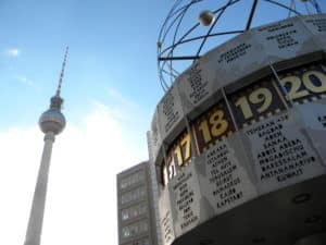 et un deuxième symbole, anciennement coté Berlin Est. L’horloge universelle et la tour de la télévision sur l’Alexanderplatz