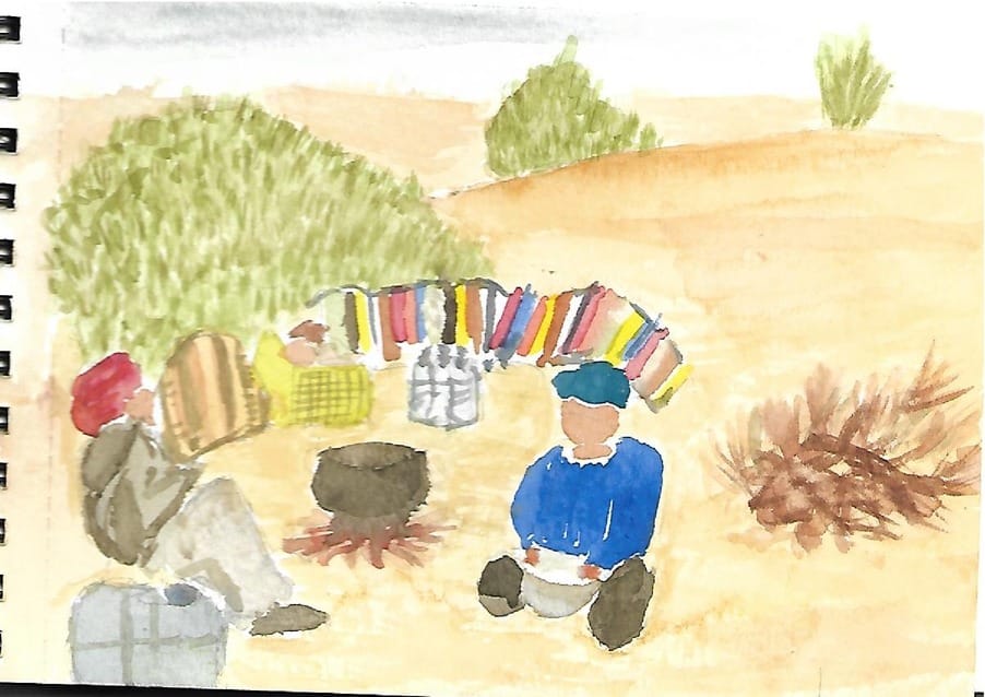 Retour dans le désert tunisien avec un dessin de Mohamed et Taieb nos fabuleux chameliers entrain de nous préparer un repas delicieux. شَهِيّ Mohamed